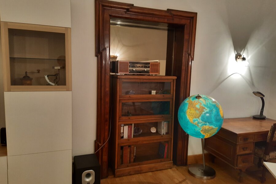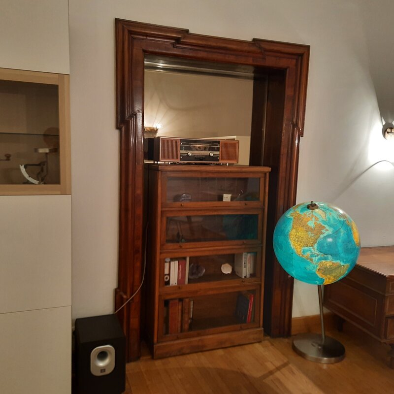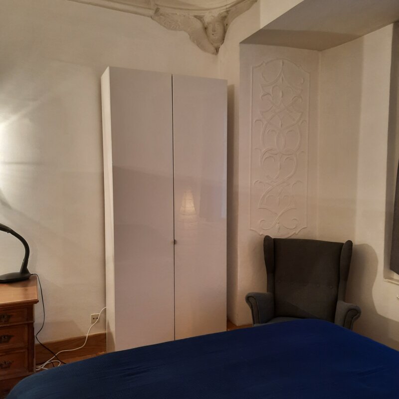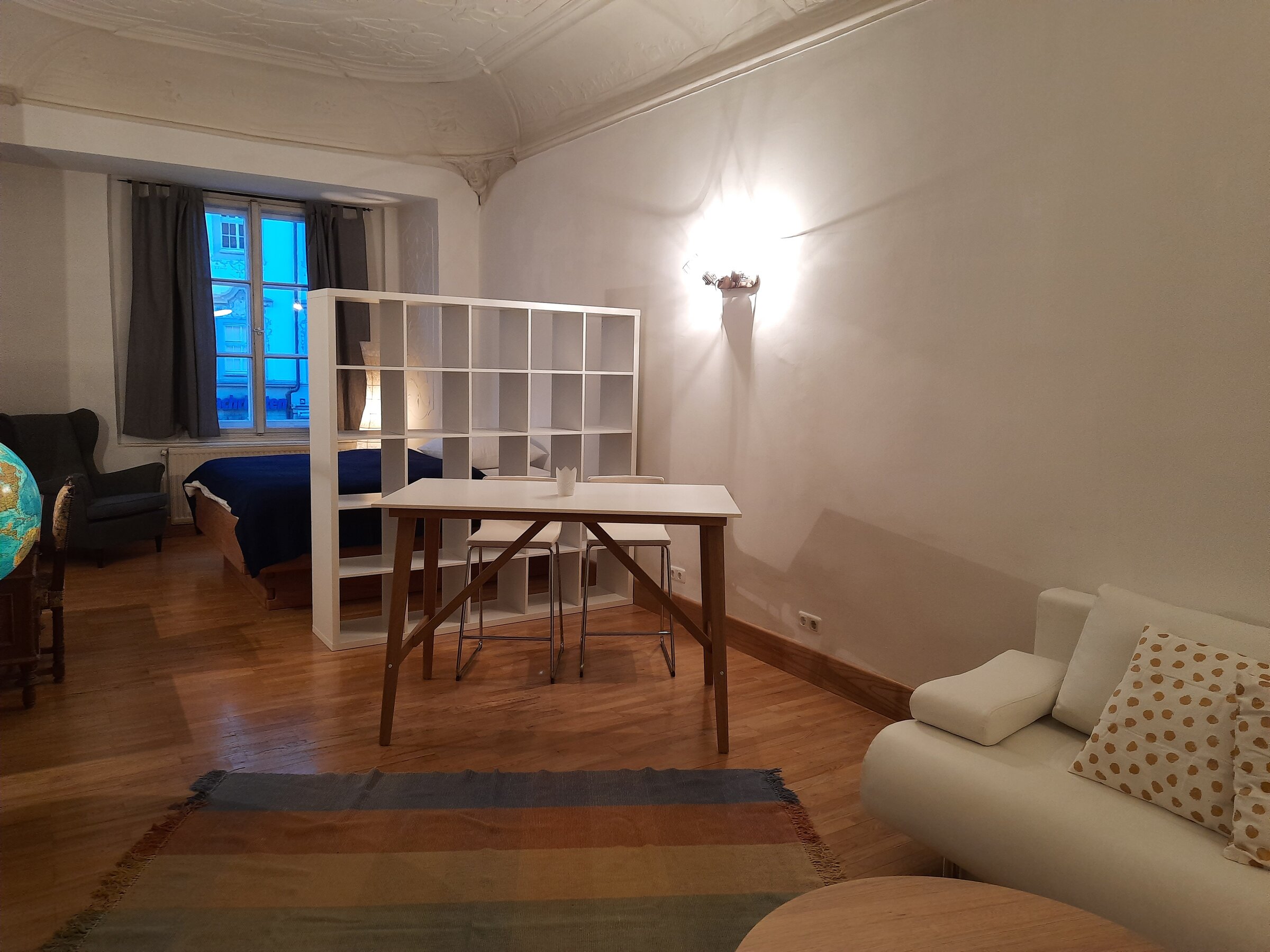 Ein großer, hoher Schlaf/Wohnraum in einem denkmalgeschützen Altstadthaus, stylischer Stuck an der Decke.