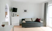 Wohnen und Schlafen: 1 x Doppelbett (1,80 m x 2 m), 1 x Sofabett (2 Personen)