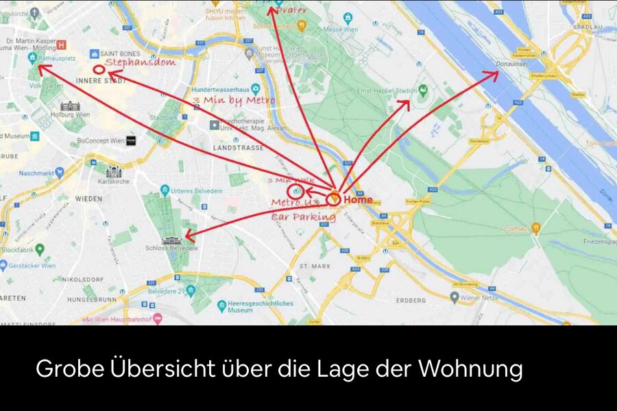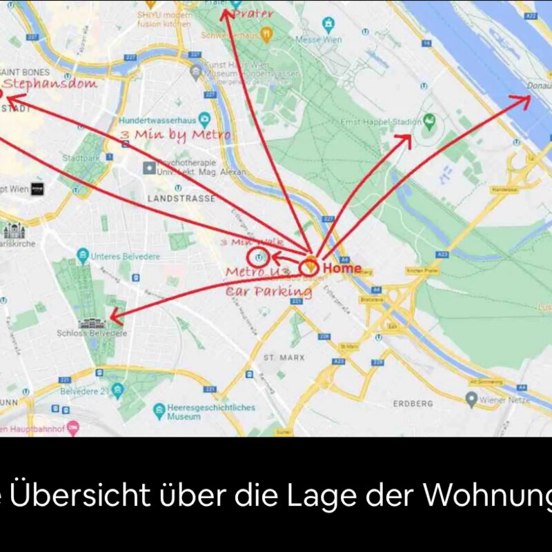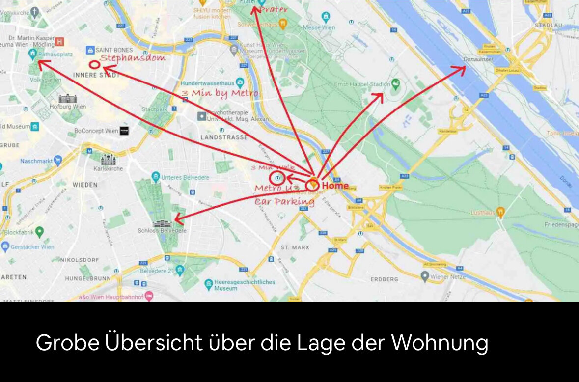 5 Minuten Zu Fuß ist man am Donaukanal. 300 Meter von der Unterkunft entfernt befindet sich eine kostenpflichtige Garage (6€/Tag). An Samstagen und Sonntagen kann man kostenlos auf den meisten Straßen parken (ausgenommen Anrainer Parkplätze).