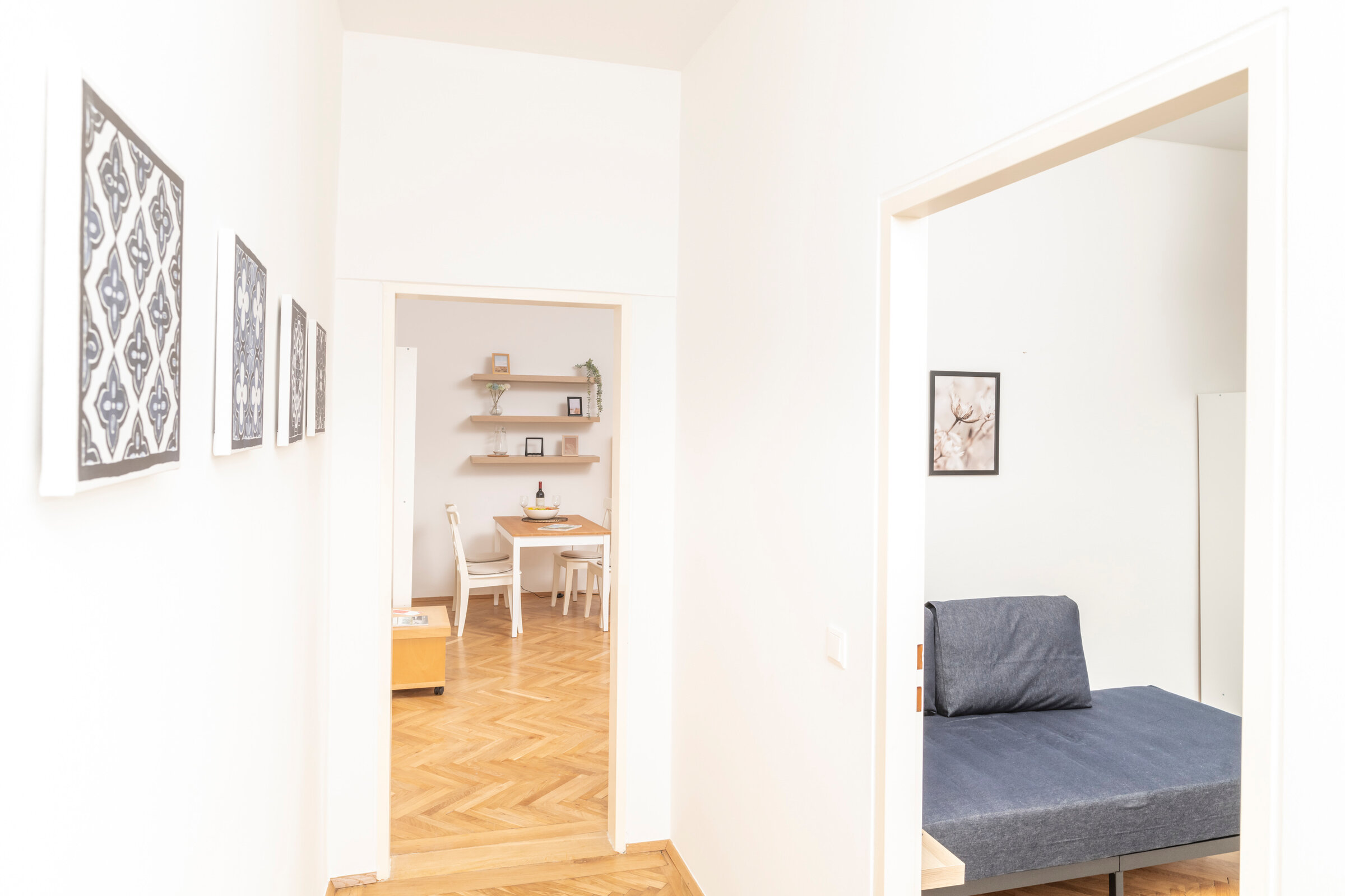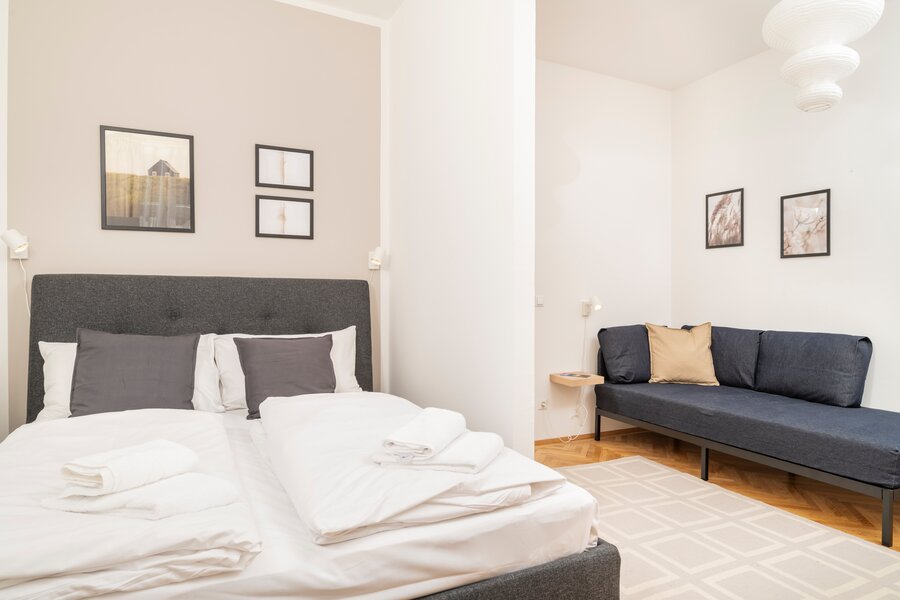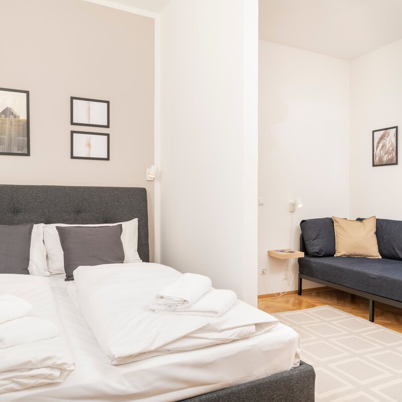 Das Apartment bietet Platz für bis zu 5 Personen mit einem geräumigen Doppelbett, Einzelbett und einem eleganten ausziehbaren Schlafsofa.
