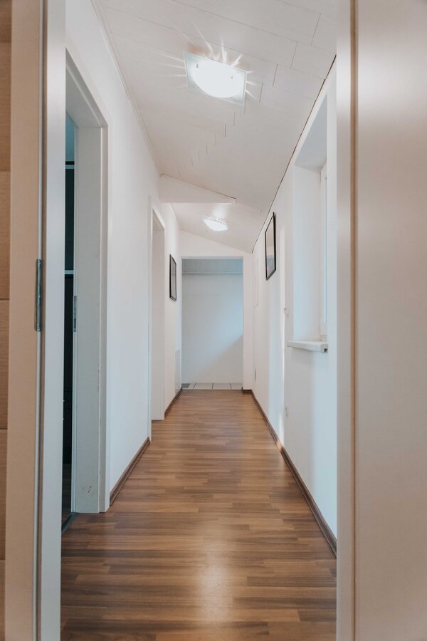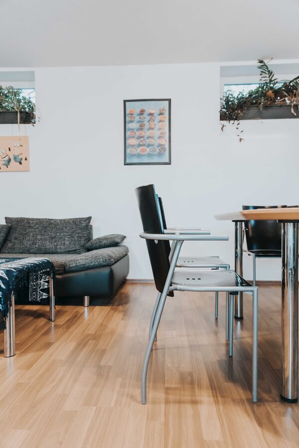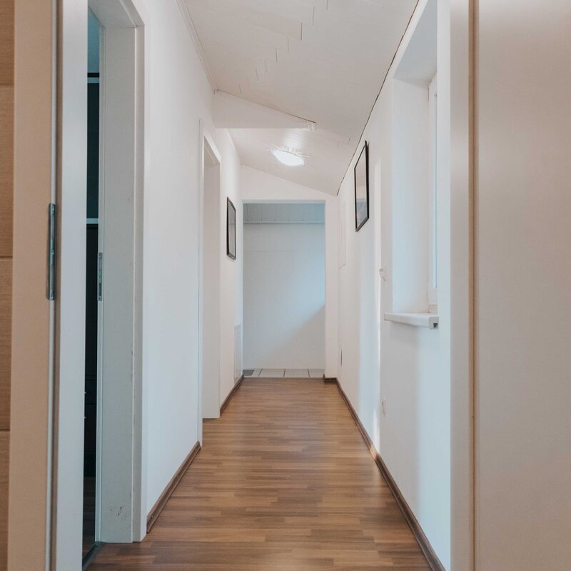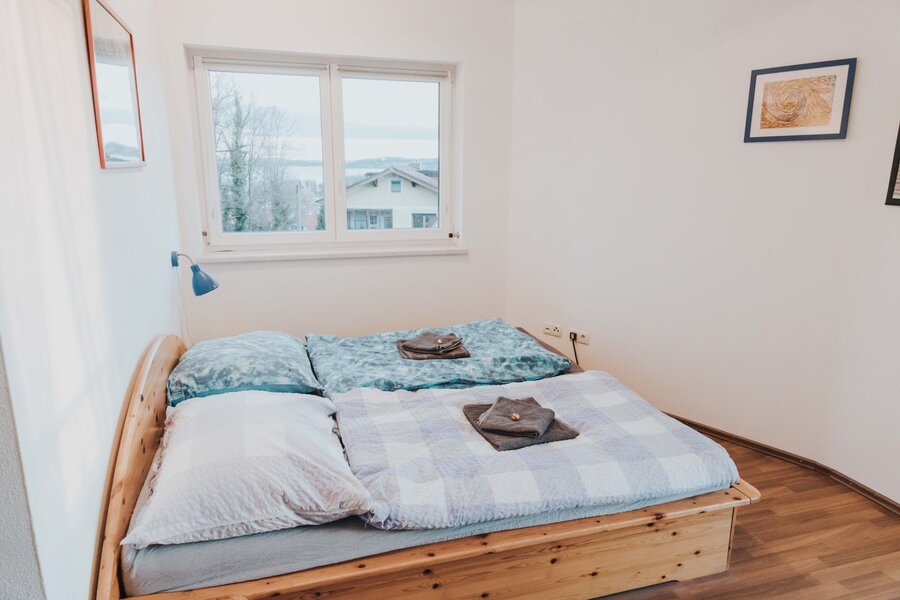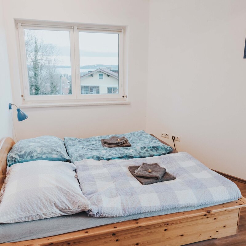Geräumige 3 Zimmer Wohnung für 6 Personen. 2 Zimmer und Bad/WC im Obergeschoss. Wohnzimmer mit offener Küche im Parterre. Balkon mit Seeblick zum Obertrumer See.