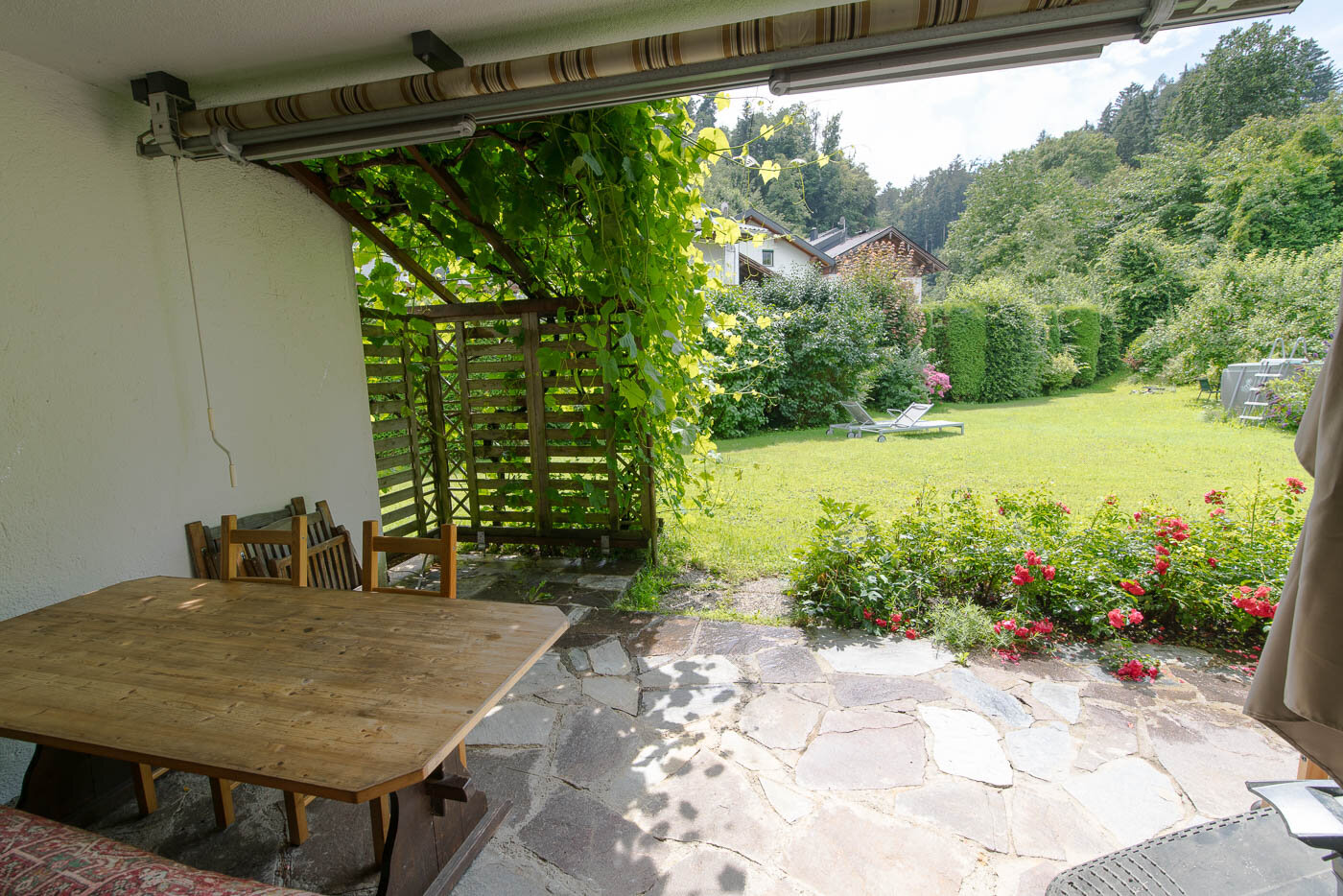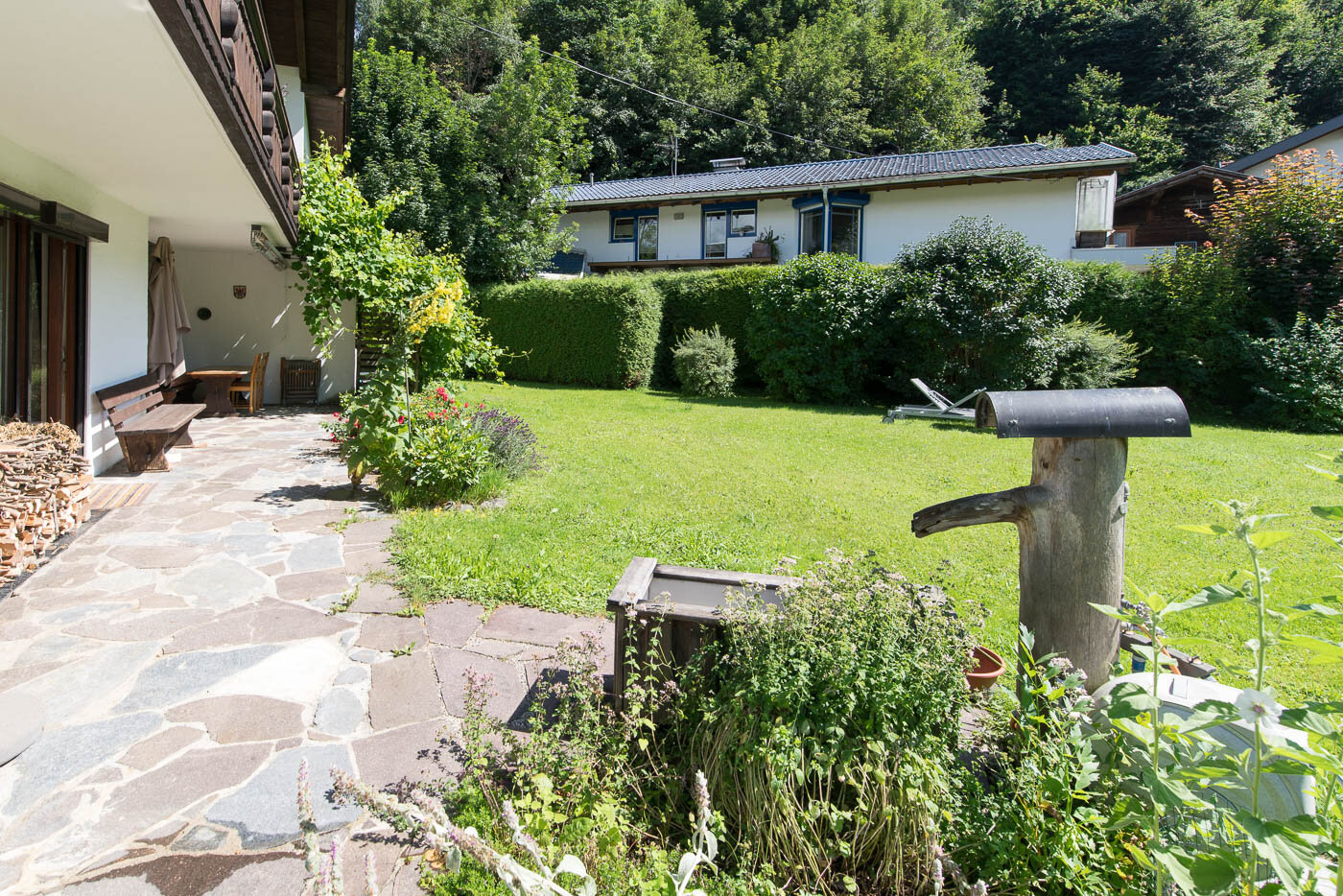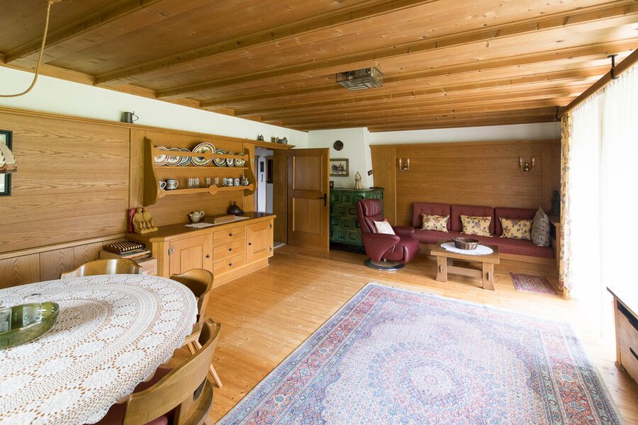 ist eine großzügig ausgelegte 3 1/2 Zimmerwohnung mit 2 Holzöfen und mind. 20m² Terrasse - unmittelbar am Waldrand
