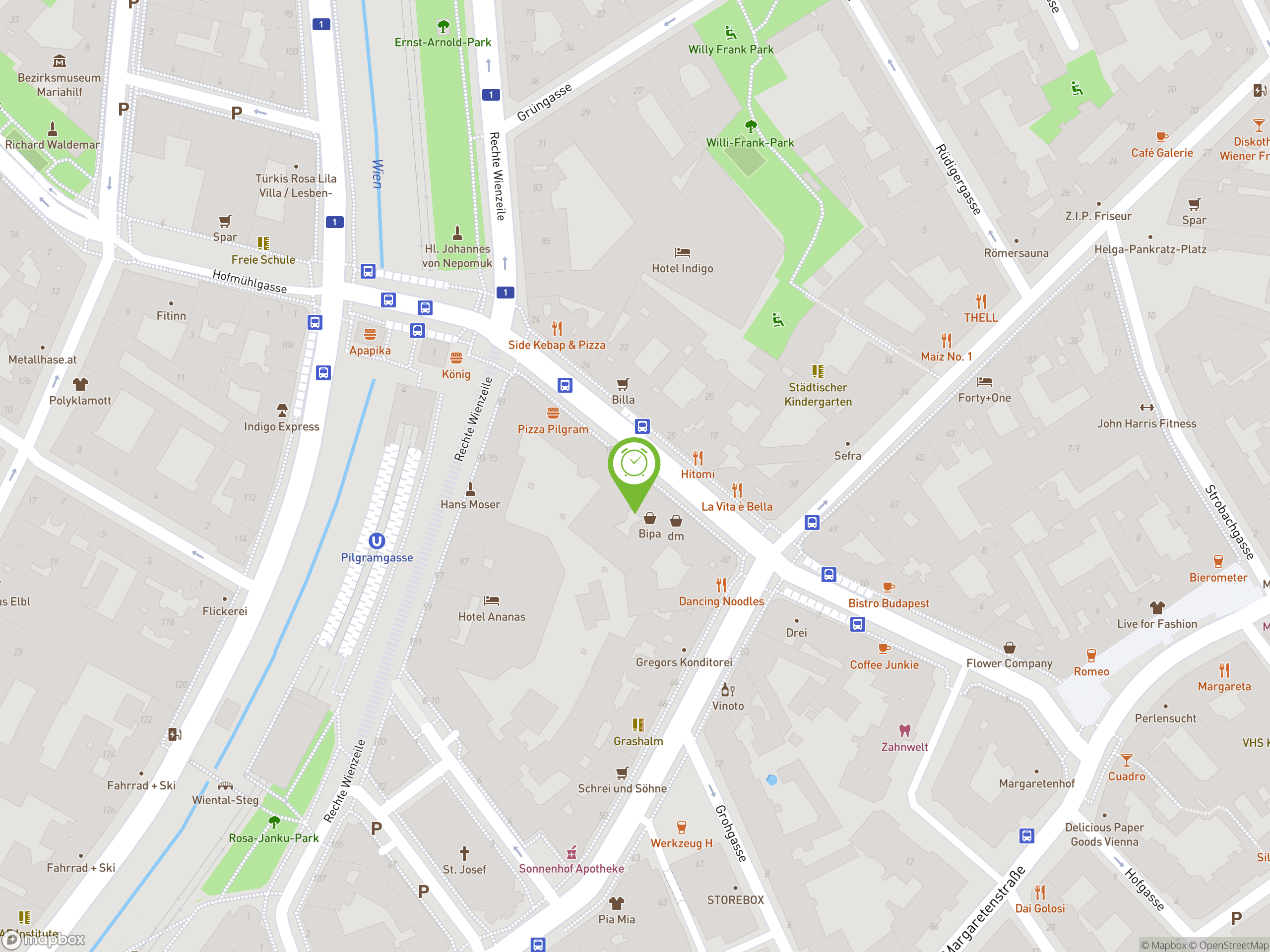 Buslinien 13a und 14 sowie die U-Bahn Station U4 Pilgramgasse sind nur wenige Schritte entfernt.