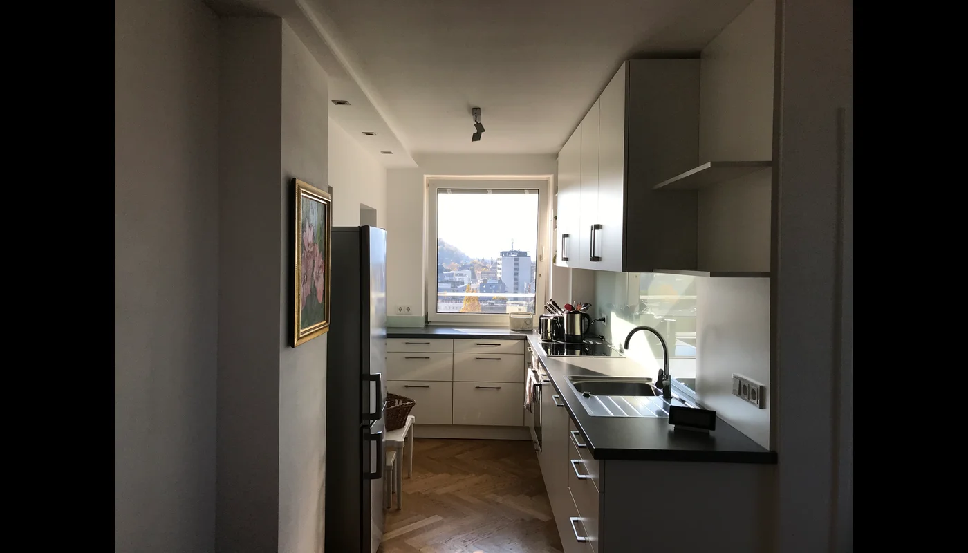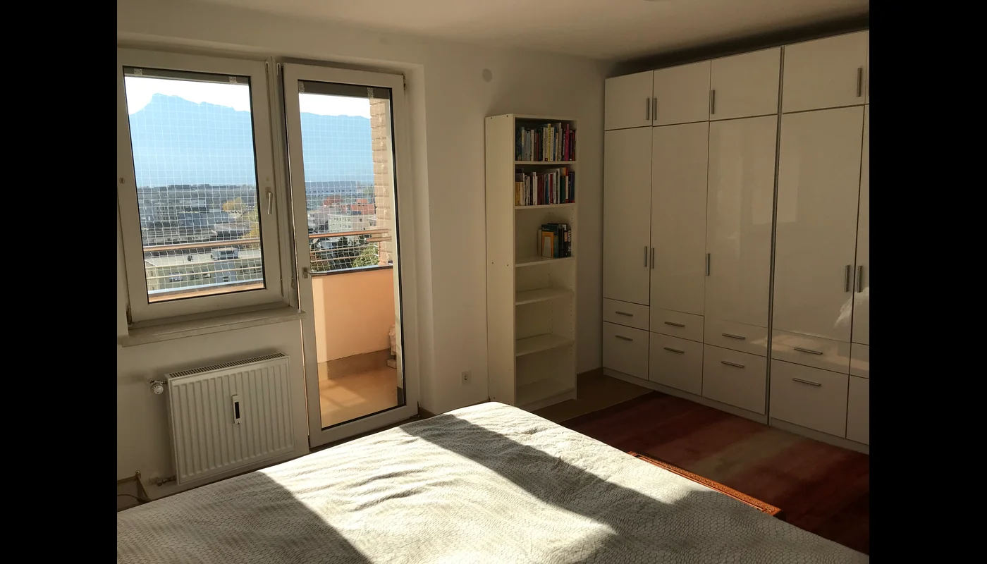 3-Zimmer-Wohnung in Salzburg zu vermieten. Die Wohnung befindet sich im 12. Stock (13 Stockwerke) und hat einen Blick auf die Altstadt und das dahinter liegende Bergpanorama von Salzburg im Süden und Richtung Flughafen und Deutschland im Westen.