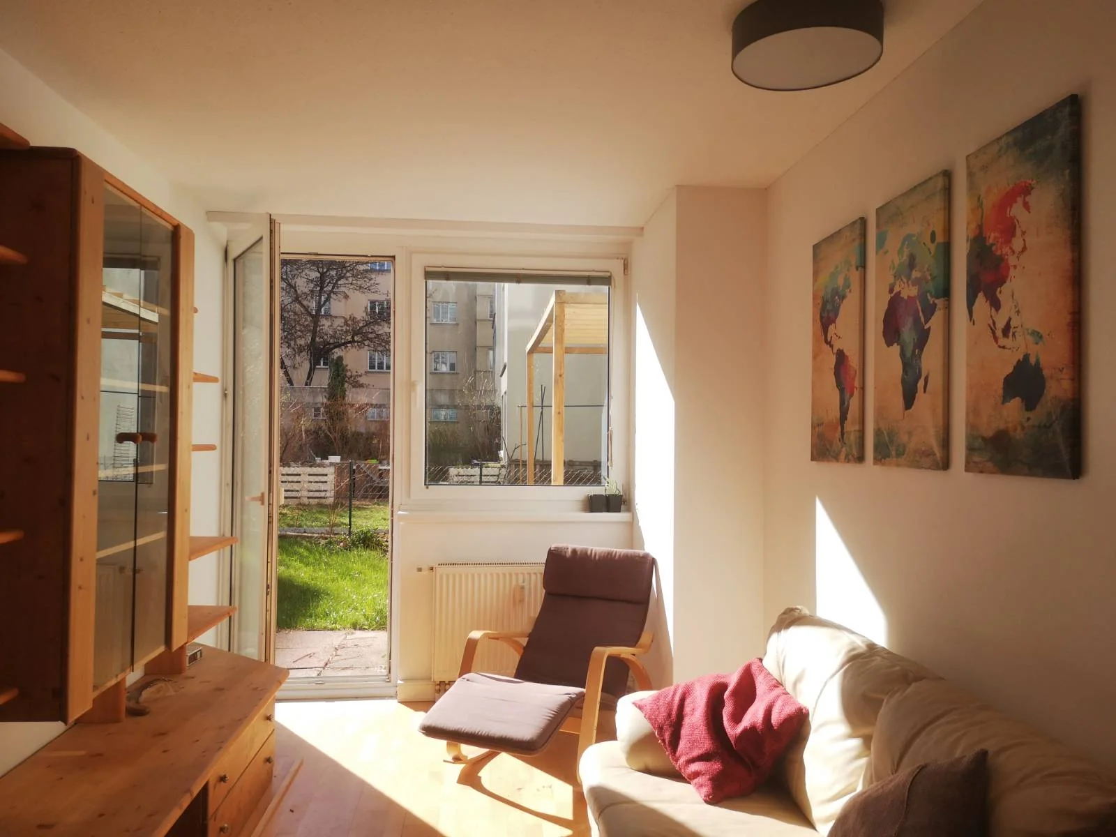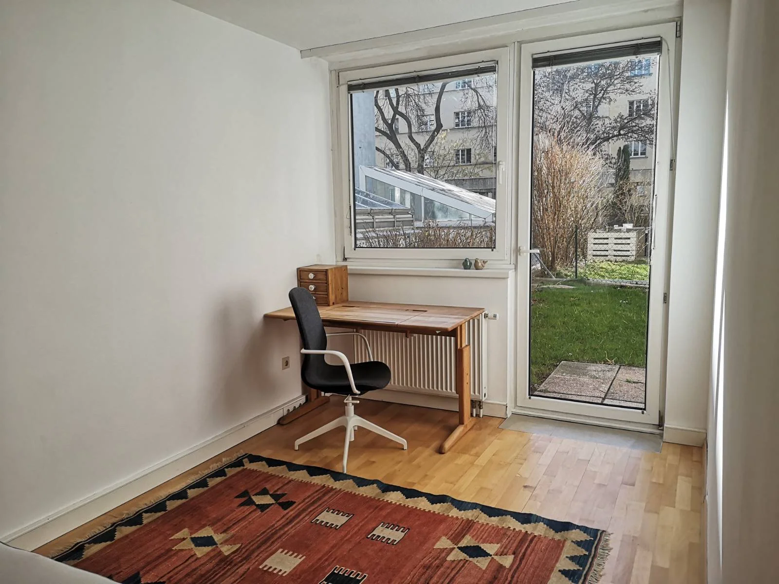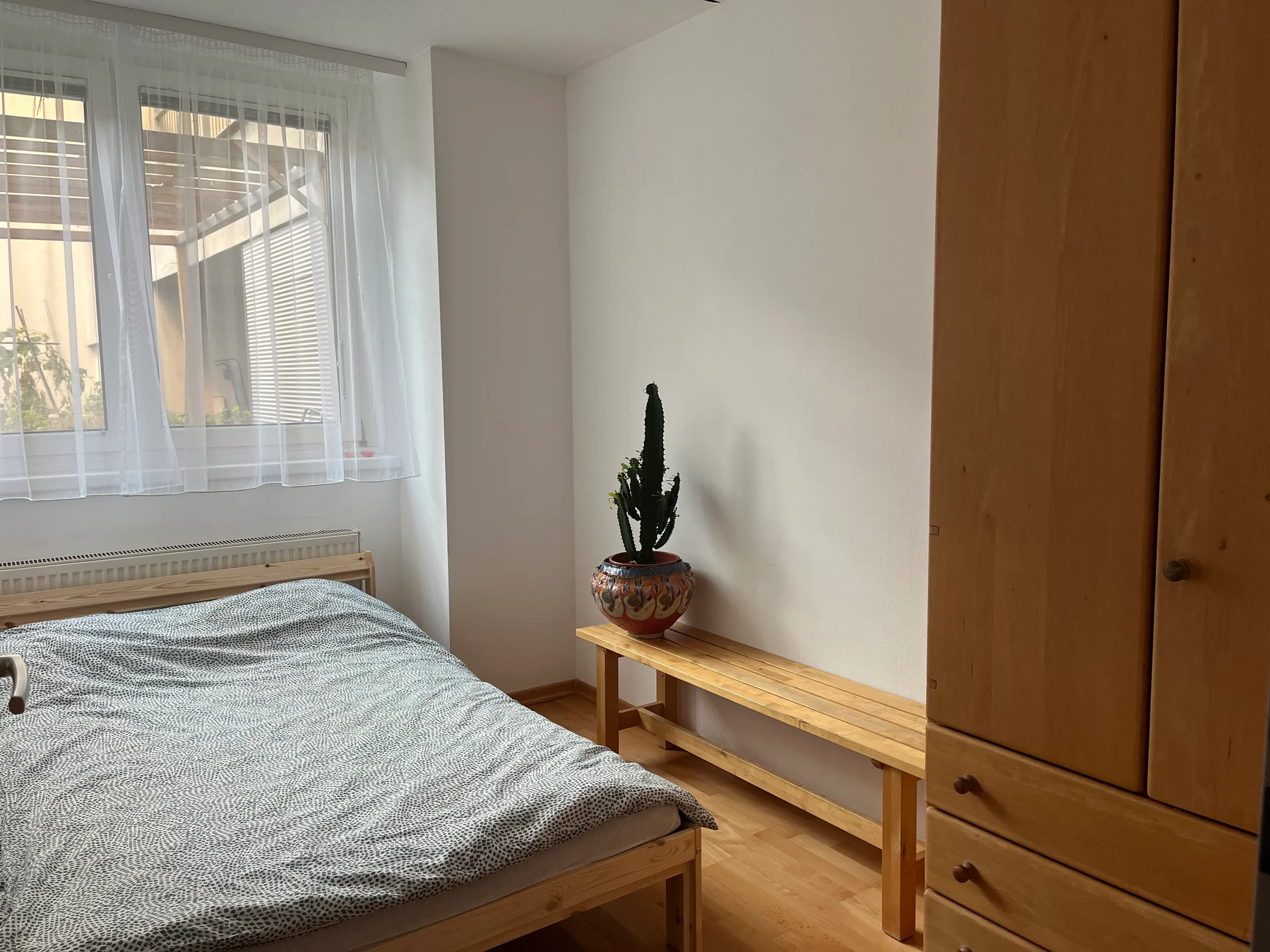 3 Zimmer Gartenwohnung. Eine Wohnküche, ein großes Schlafzimmer und ein kleines Büro/Gästezimmer/Kinderzimmer. Voll ausgestattet mit Geschirr, Bettwäsche und Handtücher für 4 Personen. Die Eigentümer wohnen in der Anlage und sprechen auch Englisch.