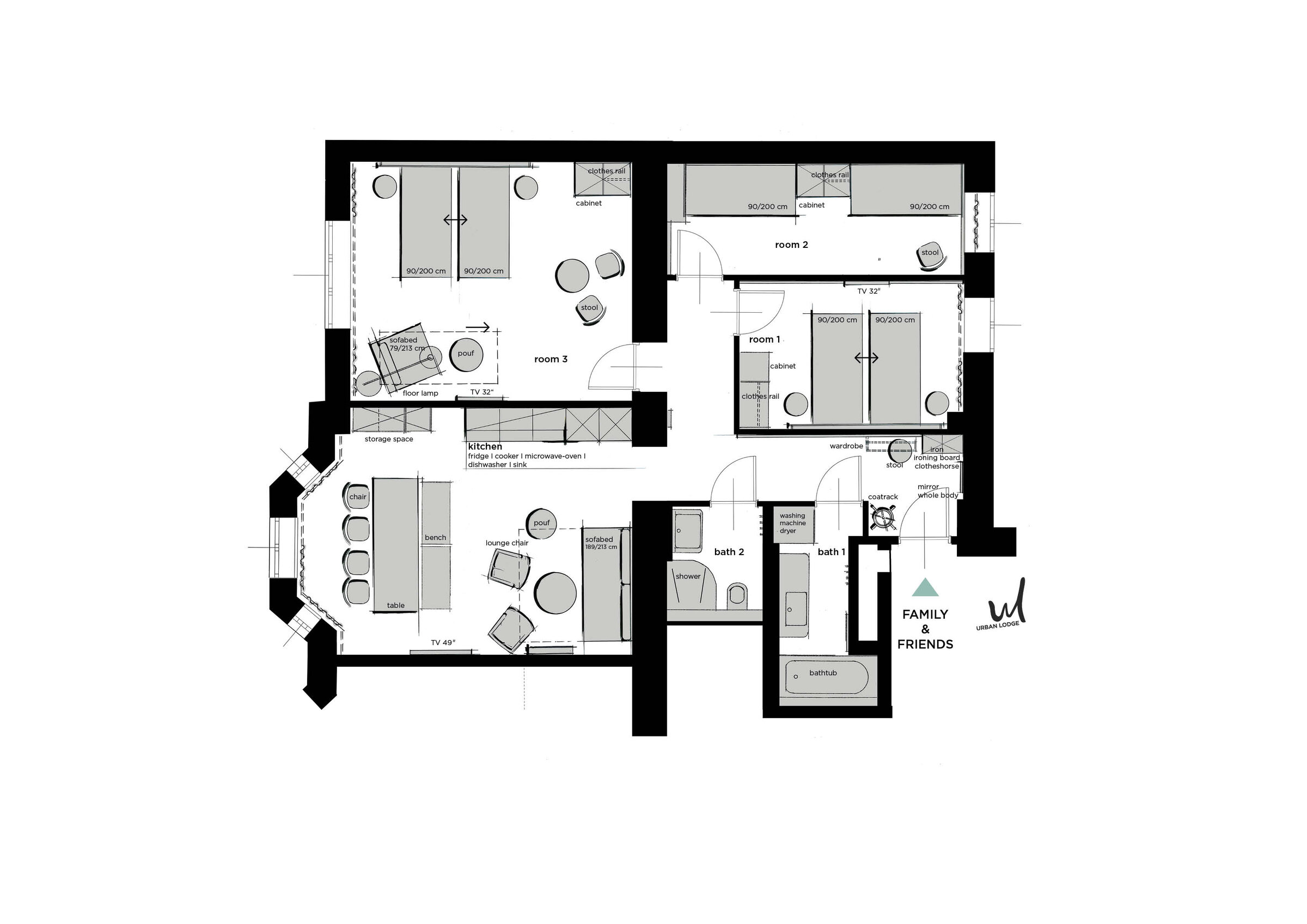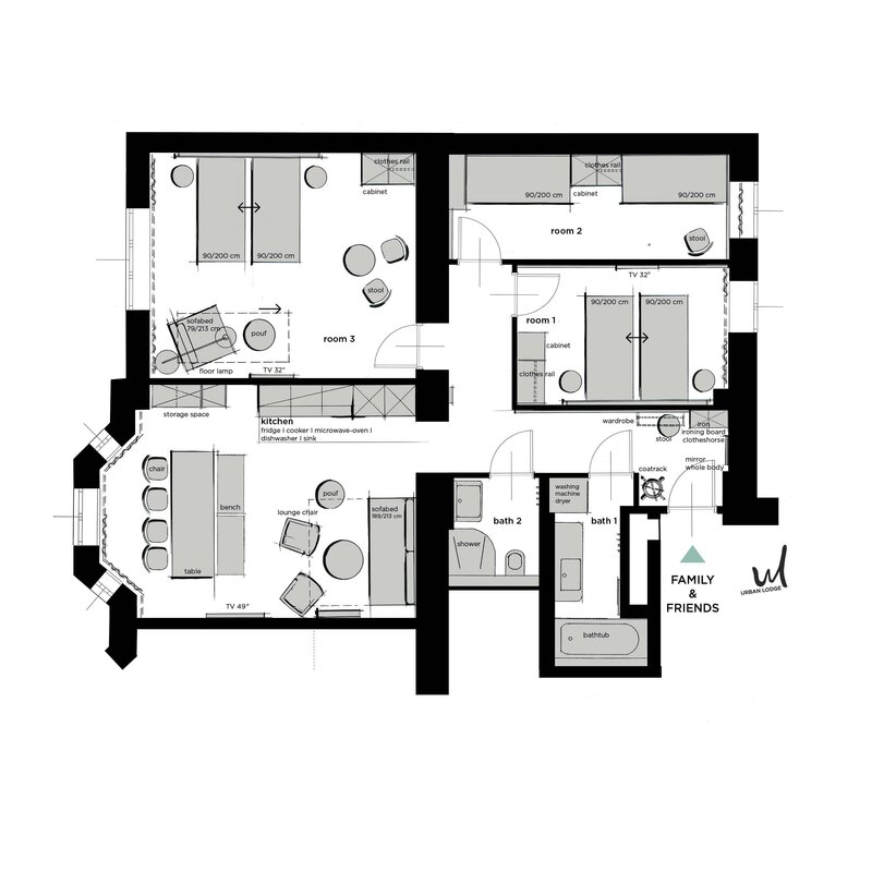2 Private Badezimmer, 3 getrennte Schlafzimmer, 1 Wohnen & Schlafen