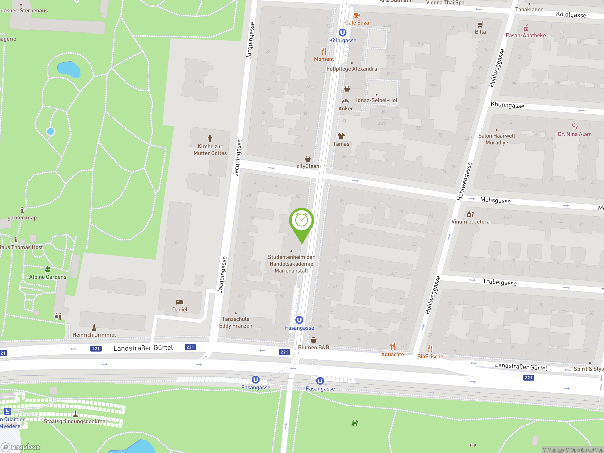 Das Apartment liegt in der Fasangasse, nur 10 Gehminuten vom Belvedere Palast entfernt und 15 Minuten vom Hauptbahnhof. Dort können Sie nationale und international Zugverbindungen nehmen, aber auch die U-Bahn linien U1 finden Sie dort. Die Straßenbahnlinien 1 und O stoppen direkt an der nächsten Straßenecke. Diese bringen Sie direkt zum Hauptbahnhof und wenn Sie in die andere Richtung fahren, erreichen Sie die Ringstraße und den ersten Bezirk. Das Apartment liegt in der Nähe des Gürtels, was die Anreise mit einem Auto erleichtert.