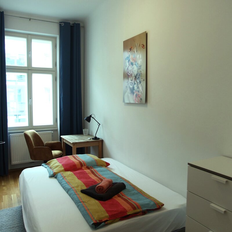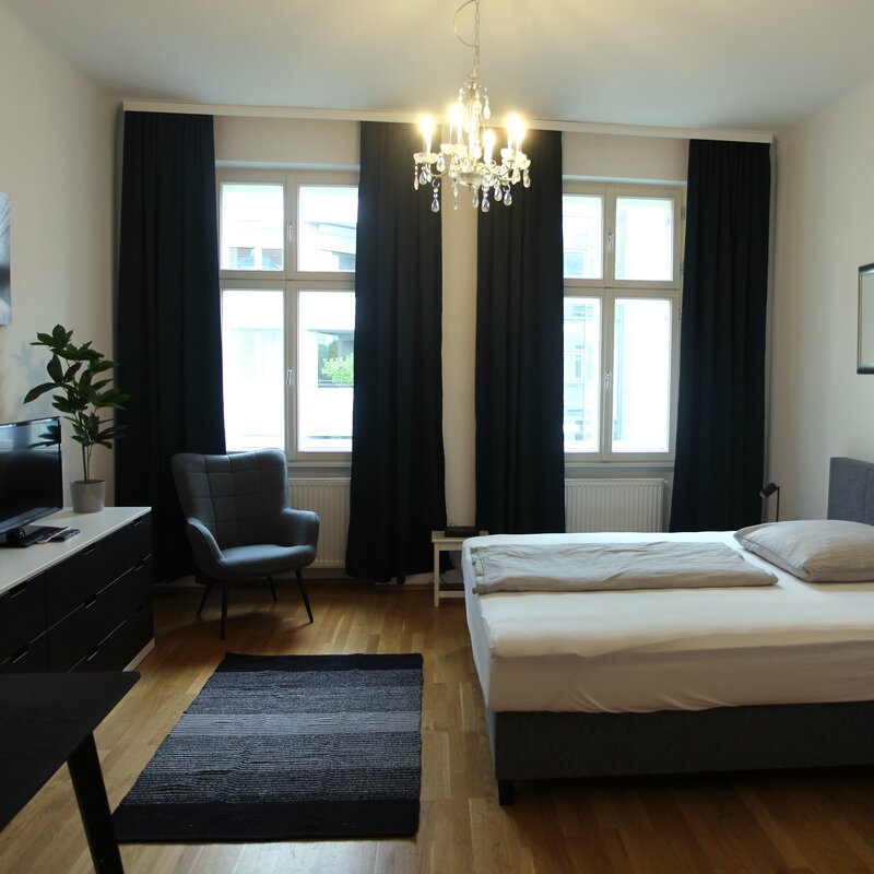 Ruhige Wohnung mit 2 Zimmern und Küche. Beide getrennten Rückzugsorte verfügen über Lagerflächen, gemütlichen Arbeitsplätzen sowie Schlafmöglichkeiten und teilen einen Essbereich. Wir heißen alle - egal ob privat oder geschäftlich, kurz- oder länger