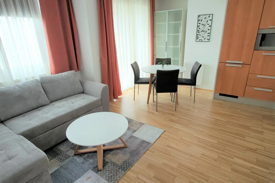 Die voll möblierte sonnige Wohnung mit Garagenplatz besteht aus einem Wohnzimmer samt Kueche und Balkon, Schlafzimmer, Vorzimmer, Bad und Toilette. Sie können mit Ihren Koffern sofort einziehen.