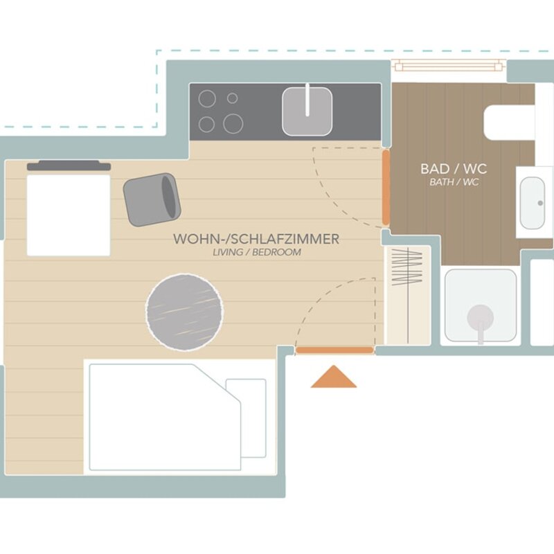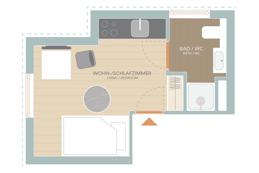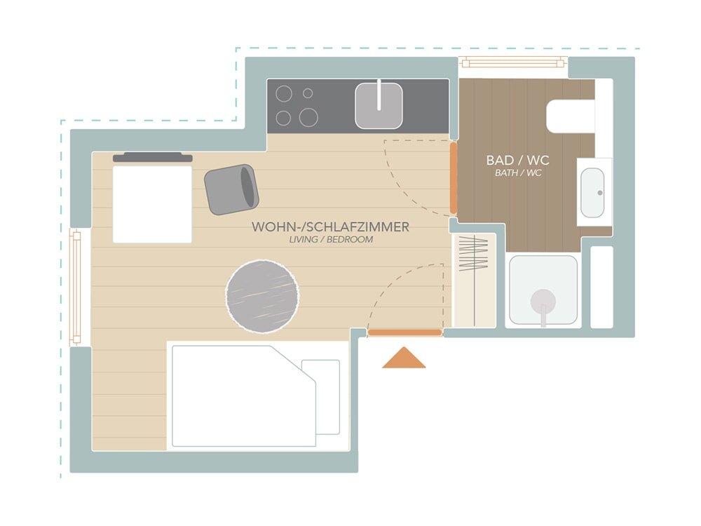 1 Privates Badezimmer, 1 Wohnen & Schlafen