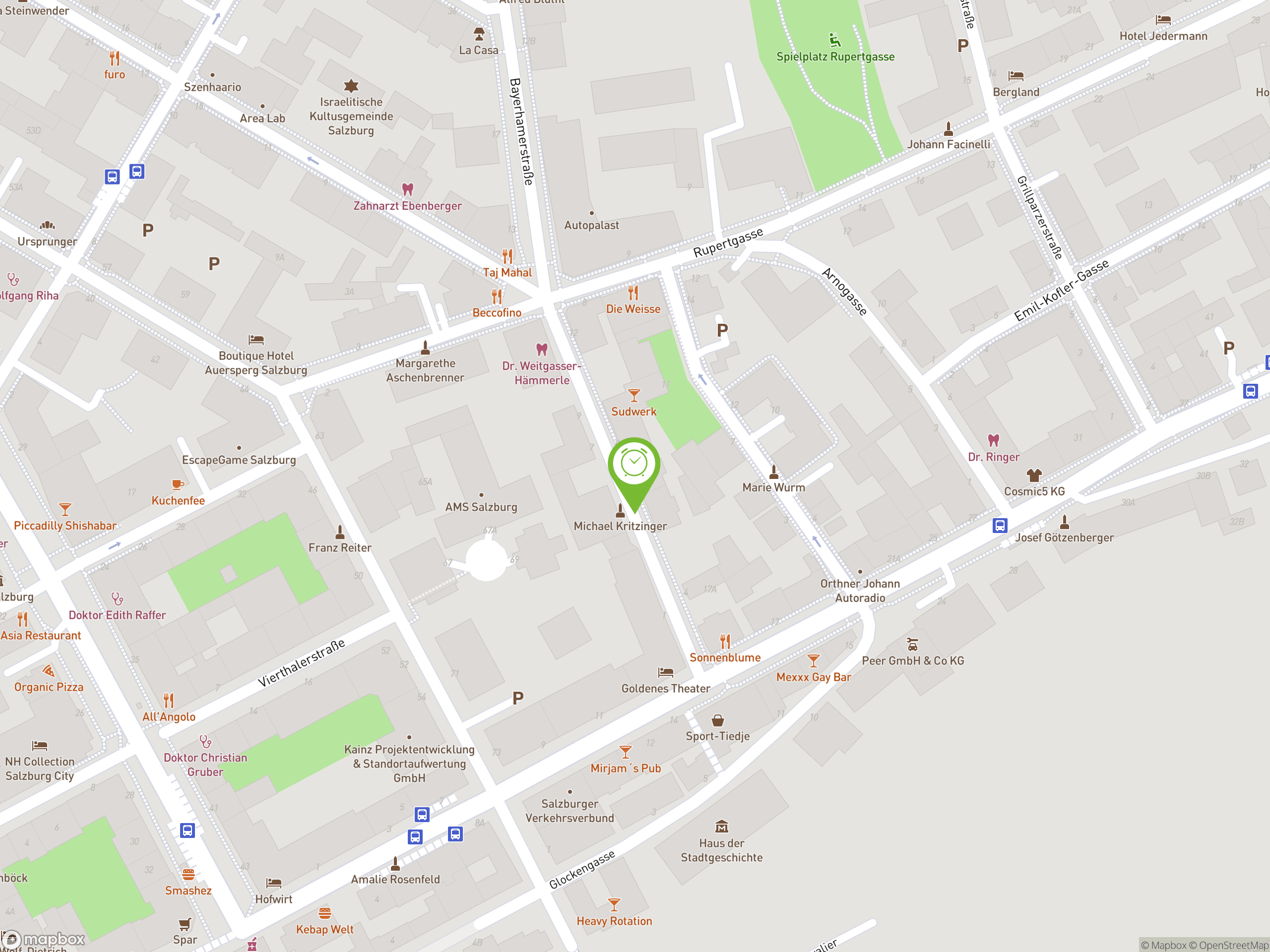 Die Bayerhamerstraße in 5020 Salzburg ist eine zentrale Lage mit einer Mischung aus Wohn- und Geschäftsinfrastruktur. Das Apartment bietet eine ruhige und doch zentrale Lage, etwa 10 Minuten zu Fuß von der Altstadt entfernt. Die Anbindung an den öffentlichen Nahverkehr ist ebenfalls gut. Die Straße ist mit mehreren Buslinien verbunden, die regelmäßig verkehren und wichtige Knotenpunkte wie den Hauptbahnhof von Salzburg schnell erreichbar machen.