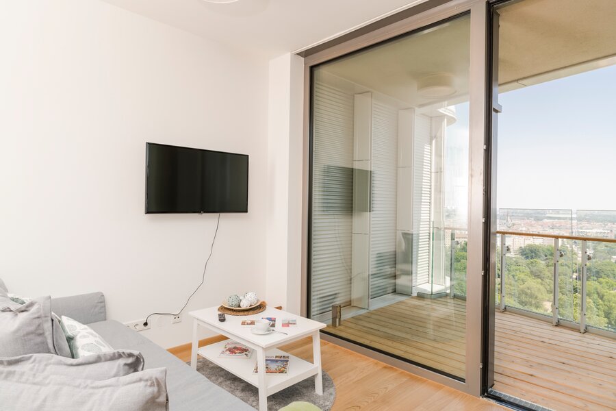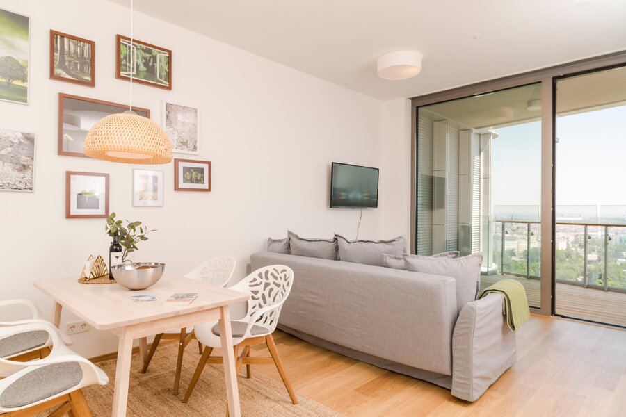 Das 50 Quadratmeter große Apartment bietet eine Unterkunft für 4 Personen auf einem Doppelbett und ein ausziehbares Sofa im charmanten Wohnzimmer.