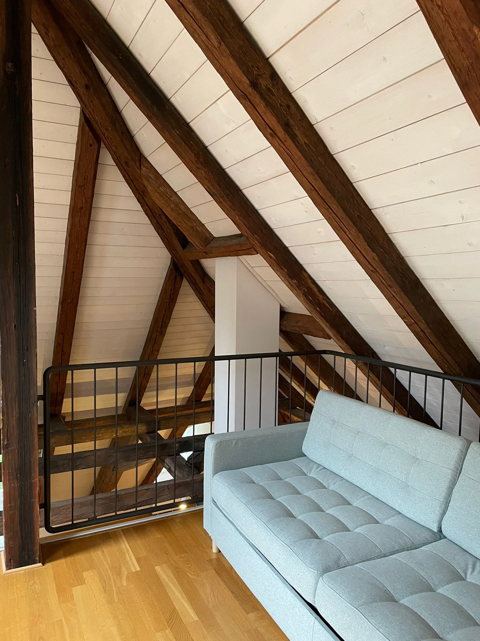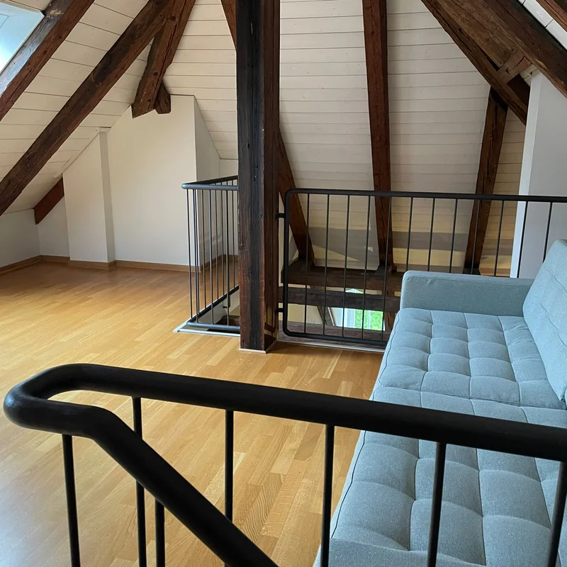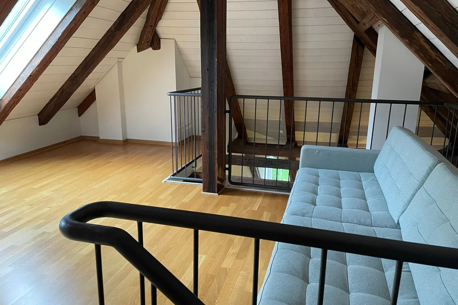 Umringt von Grünflächen, befindet sich das Dachgeschoss-Apartment im Fondachhof-Areal, mit nur wenigen Parteien.