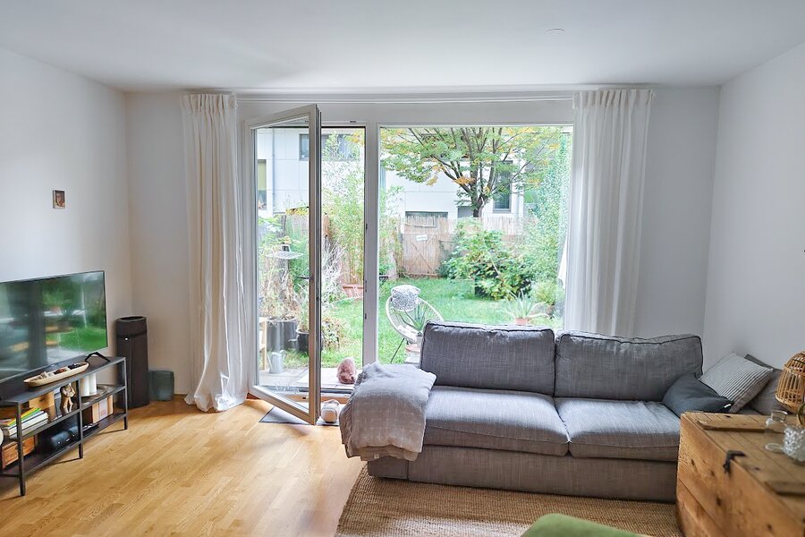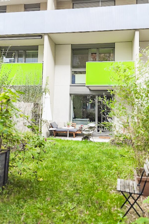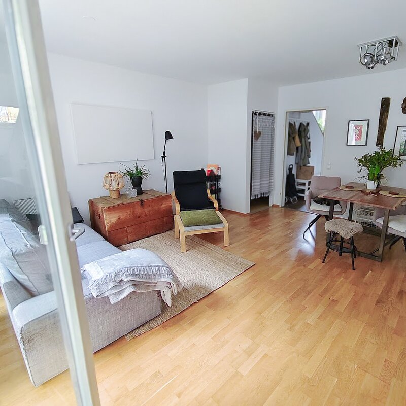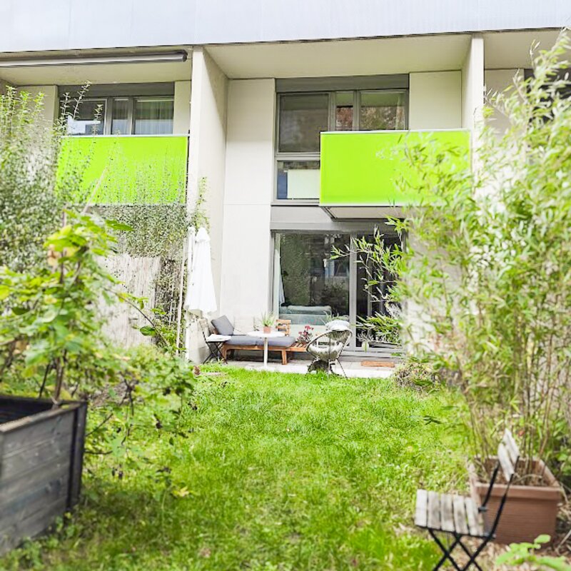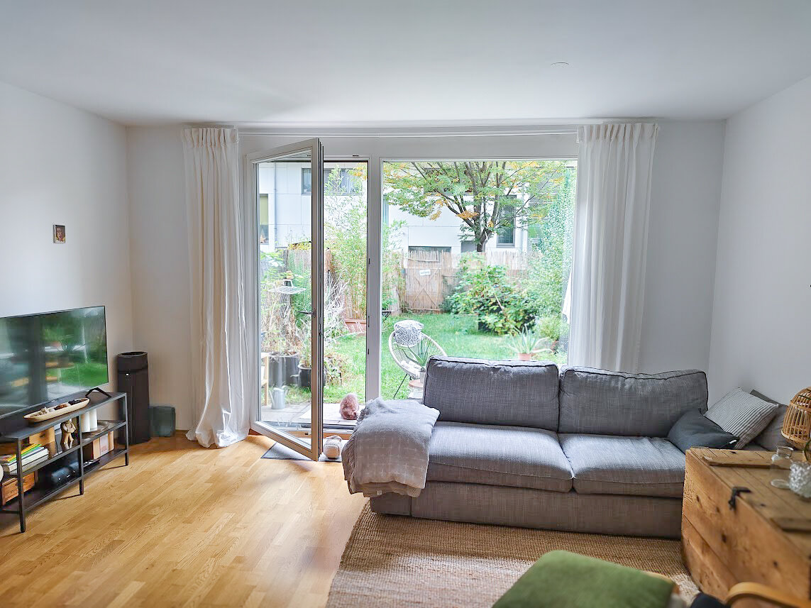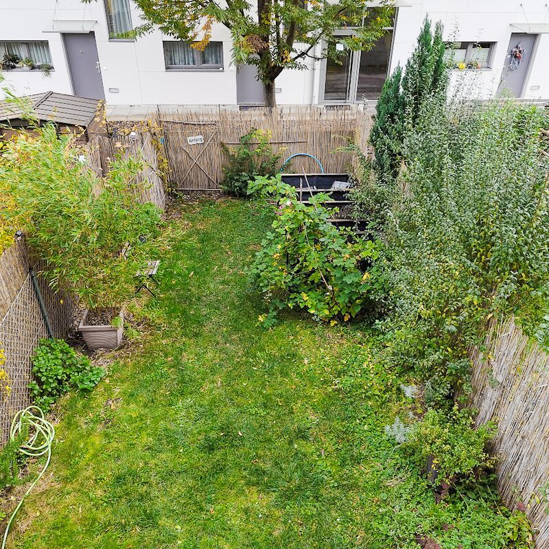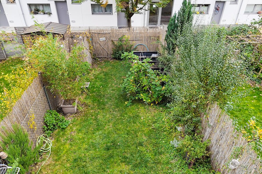 This maisonette apartment offers an ideal layout: kitchen, guest WC and living room with garden access on the ground floor; upstairs, a bathroom and two bedrooms – one with a private balcony.