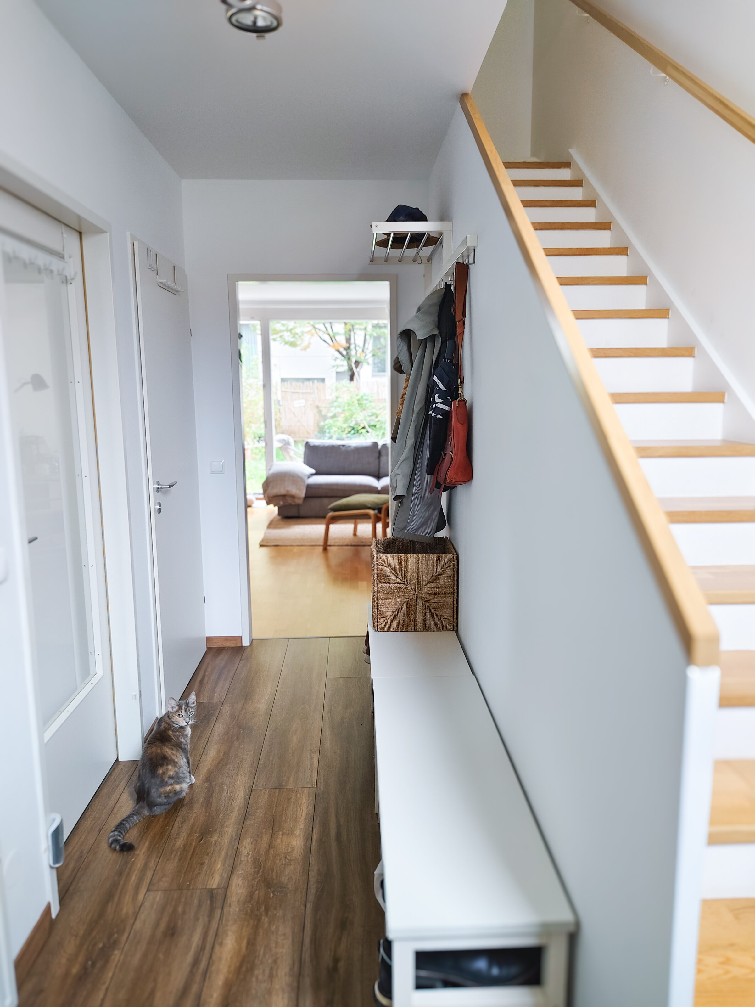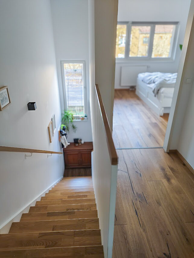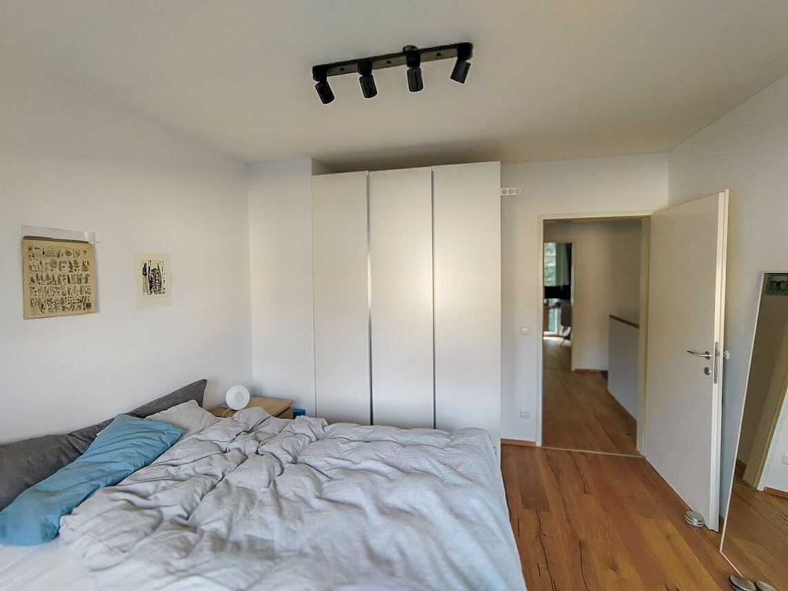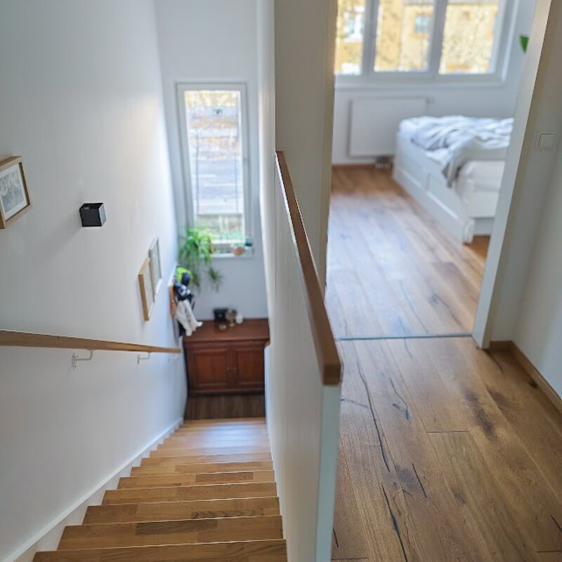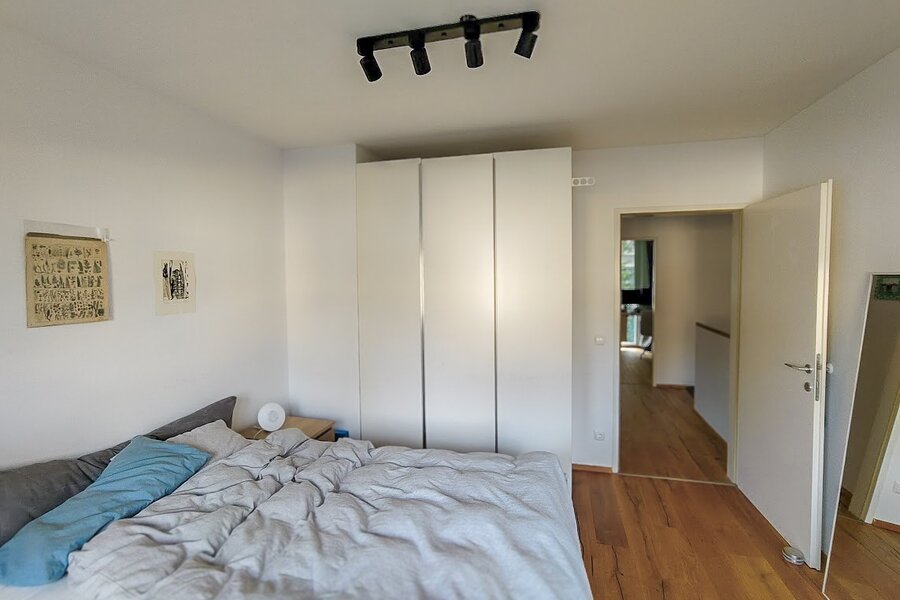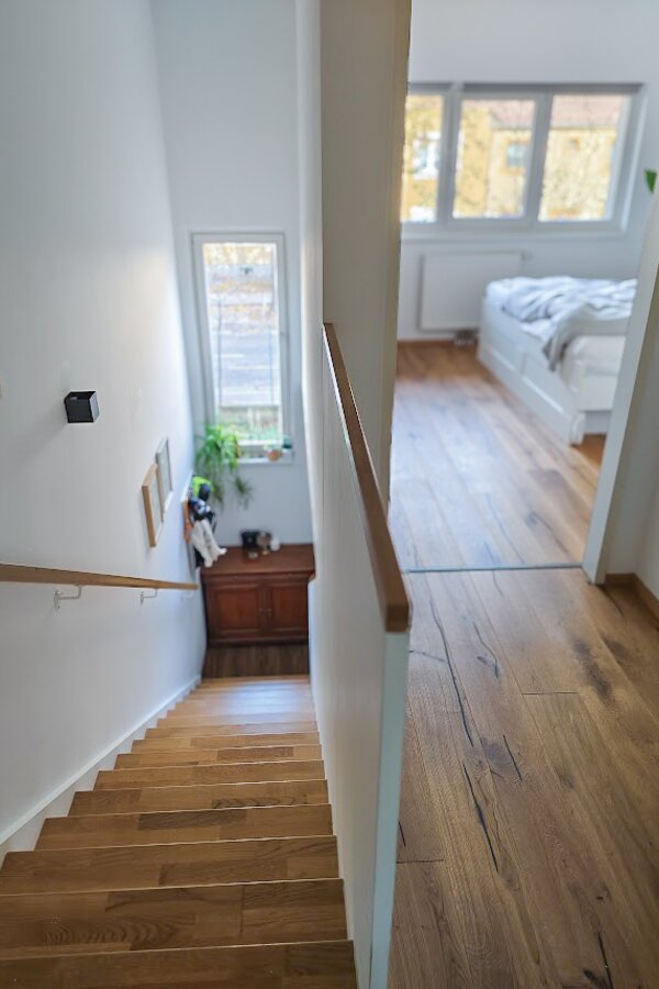 This maisonette apartment offers an ideal layout: kitchen, guest WC and living room with garden access on the ground floor; upstairs, a bathroom and two bedrooms – one with a private balcony.