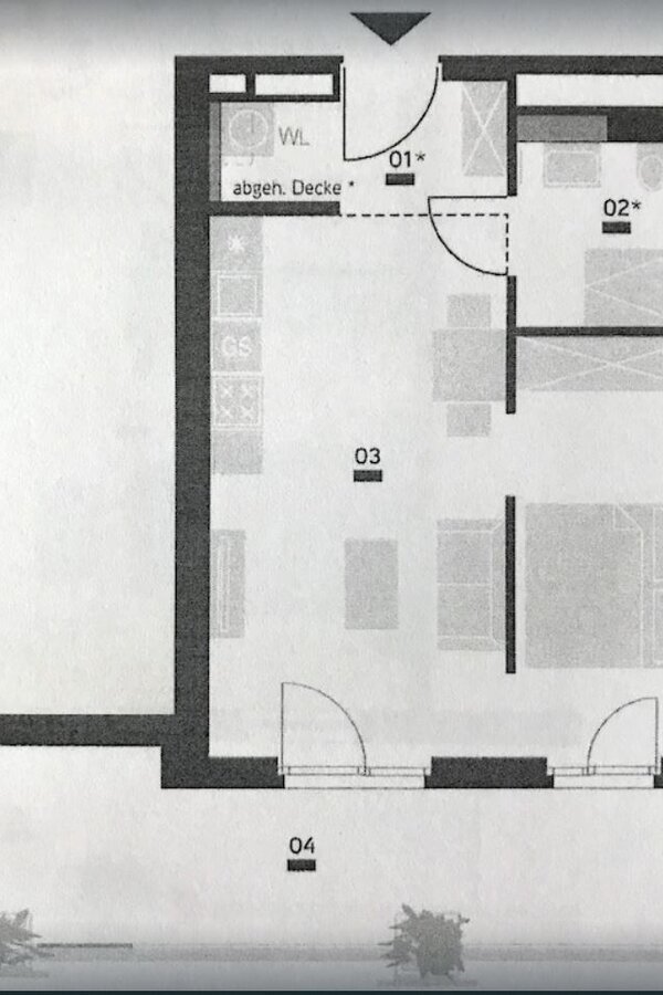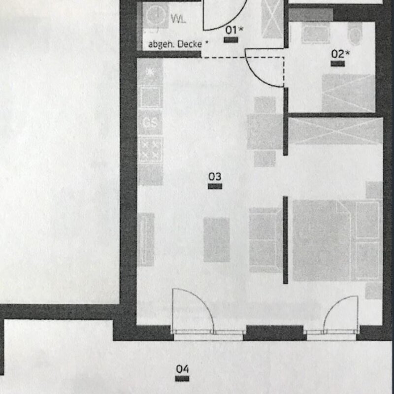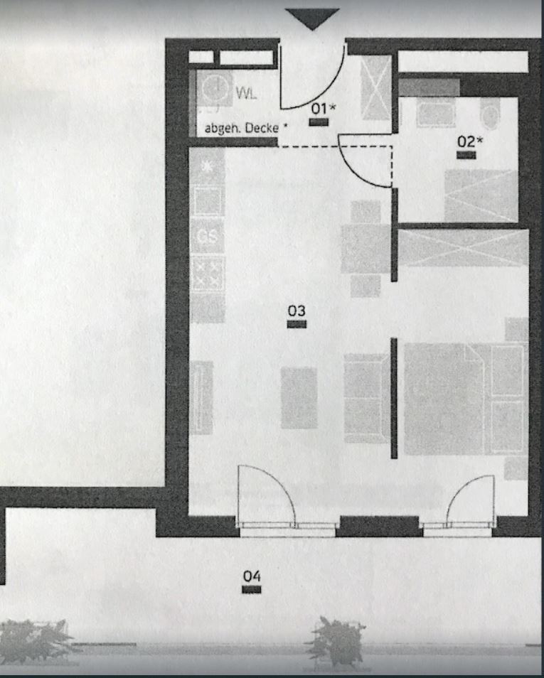 Entrance hall, large living room area including kitchen, bedroom with partition wall, bathroom with shower and toilet, external blinds. Despite the central location, this property is quiet.