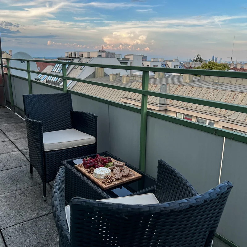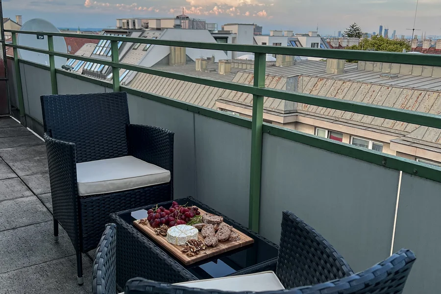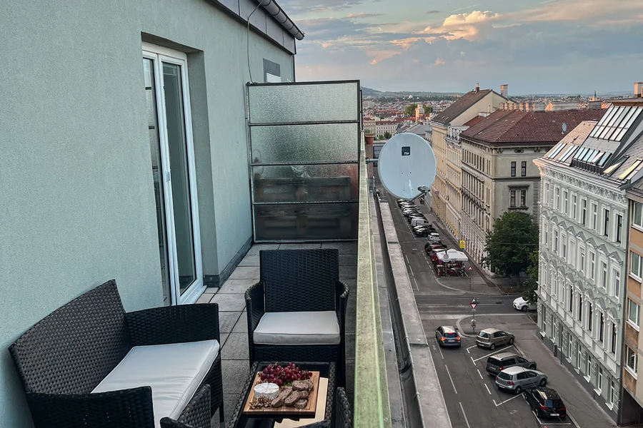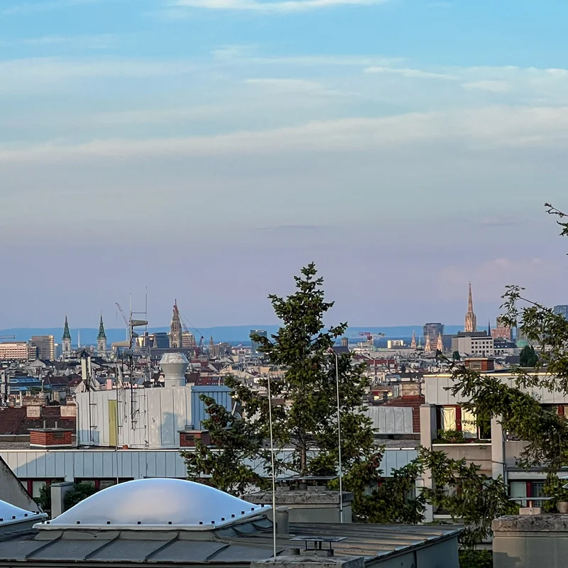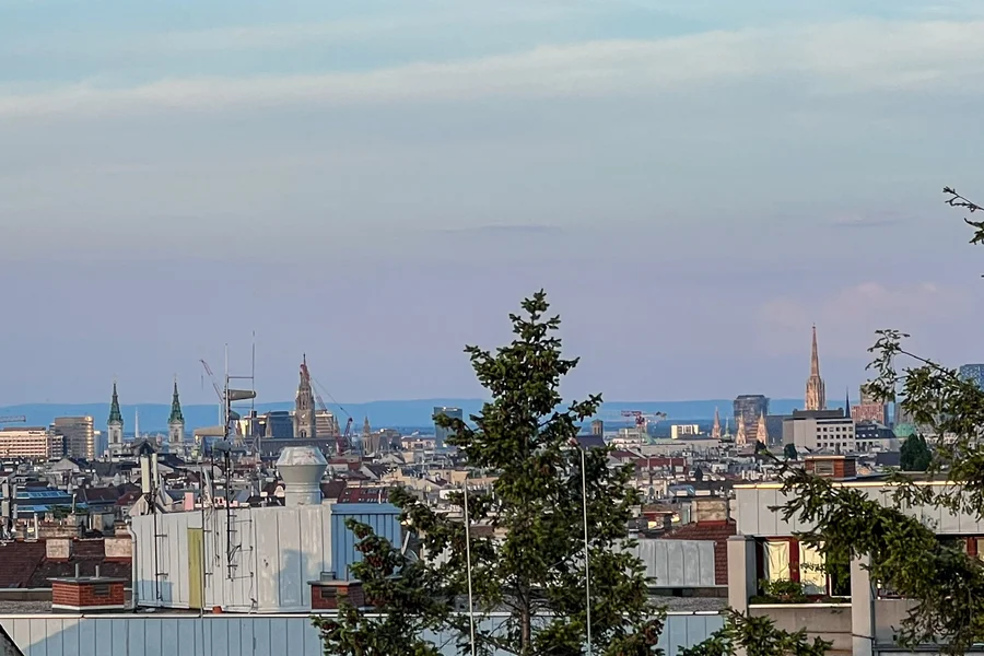 Top-floor unit with a panoramic view of Vienna — from Stephansdom and Rathaus to Kahlenberg and DC Tower.