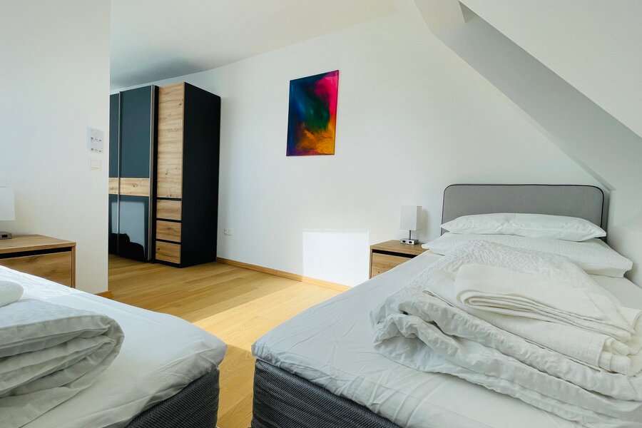 The “Spacious Penthouse Apartment” offers a generous living space of 135 m² and includes four rooms, a bathroom, a WC, and a terrace.