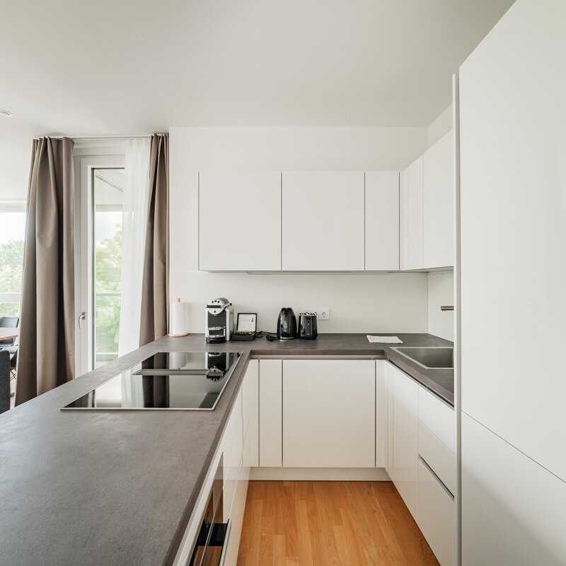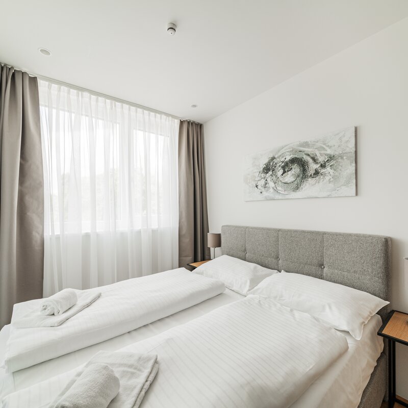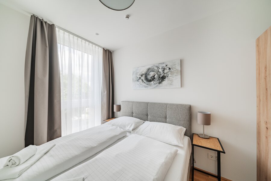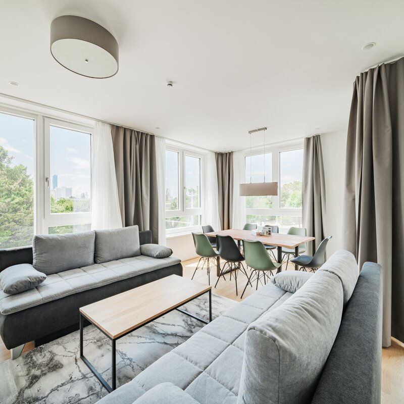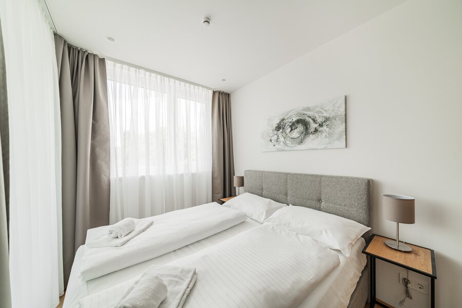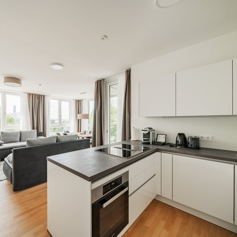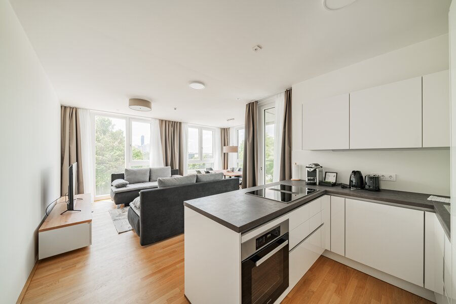The new and modernly furnished 3-bedroom apartment is located in a recently built high-rise building near Donau Zentrum shopping center and has a balcony/loggia featuring a seating area.