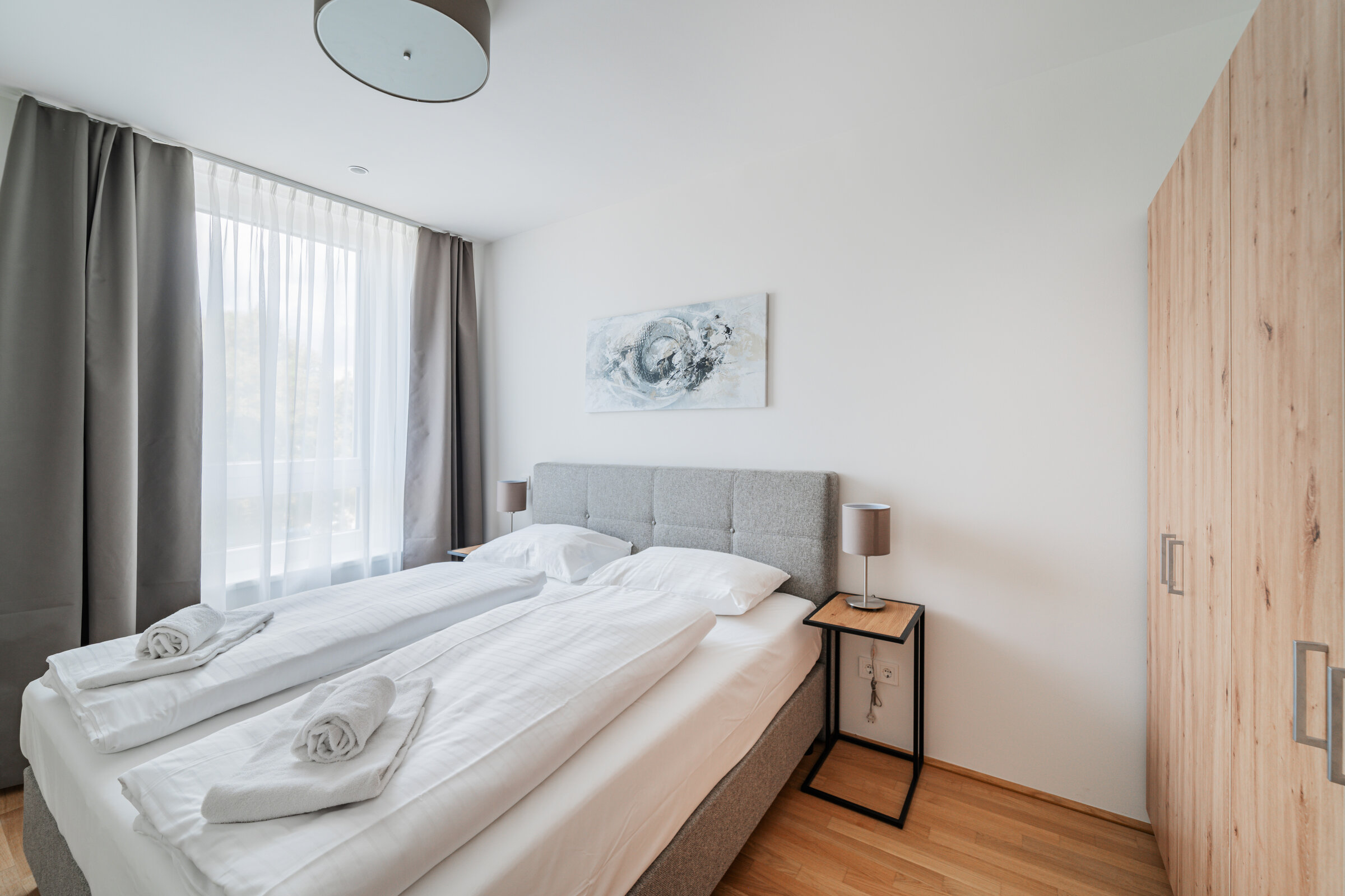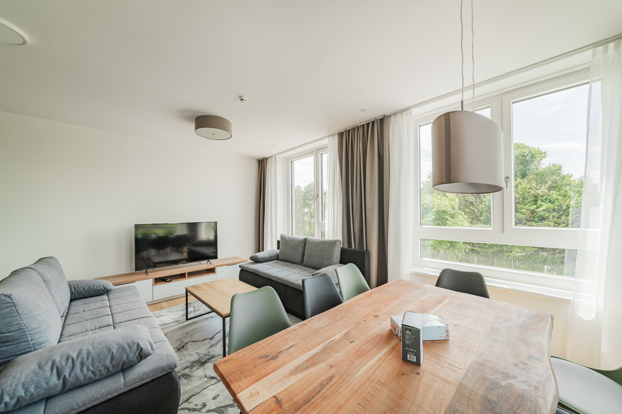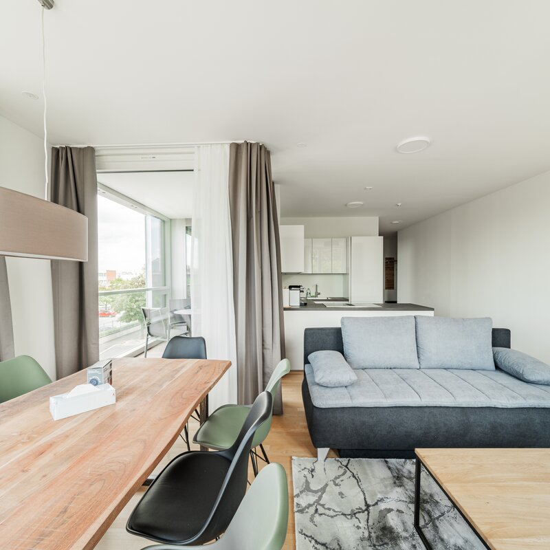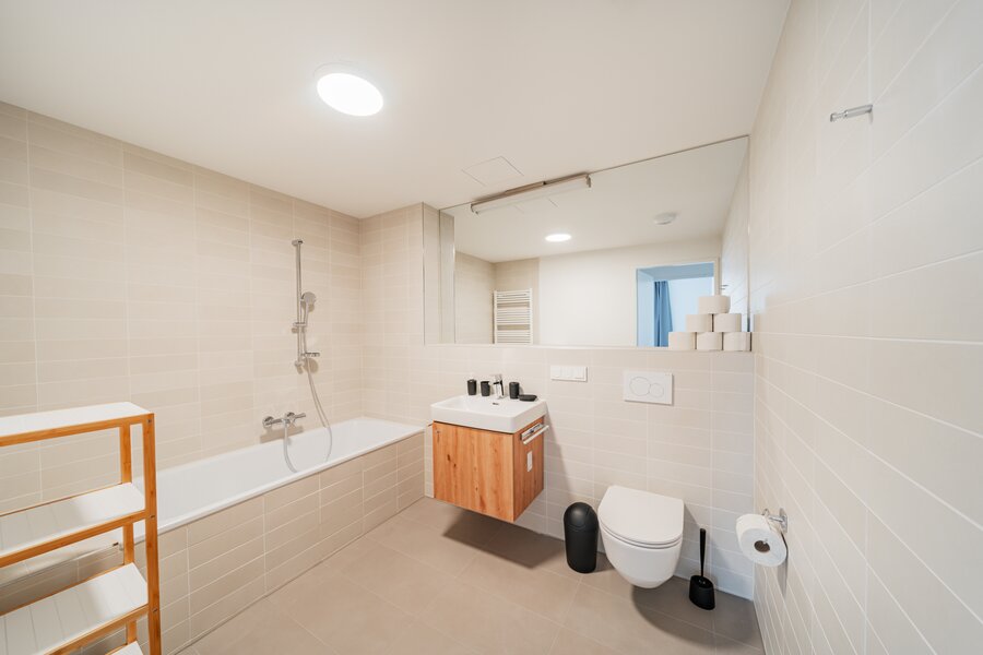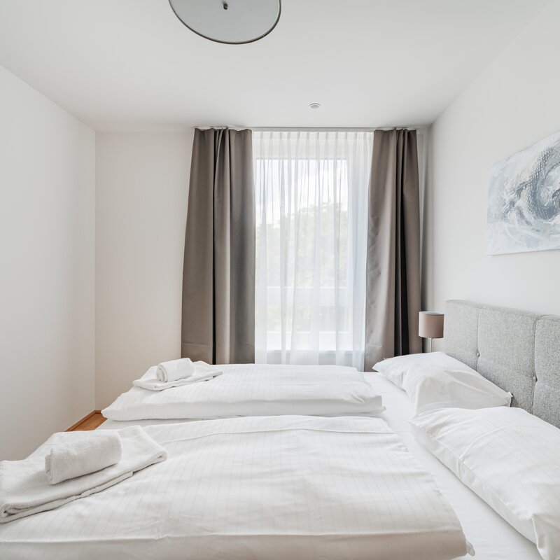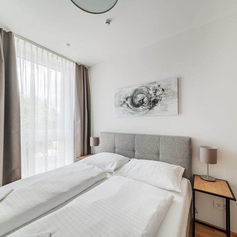 The new and modernly furnished 3-bedroom apartment is located in a recently built high-rise building near Donau Zentrum shopping center and has a balcony/loggia featuring a seating area.