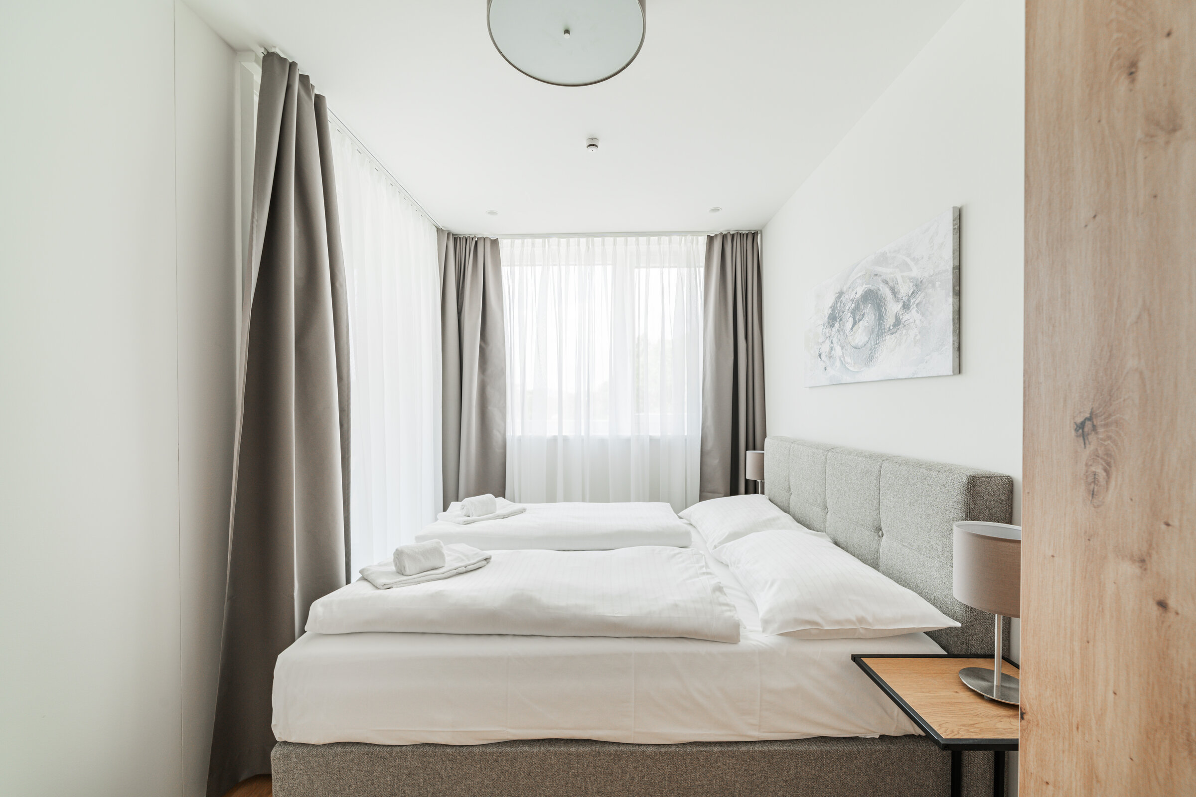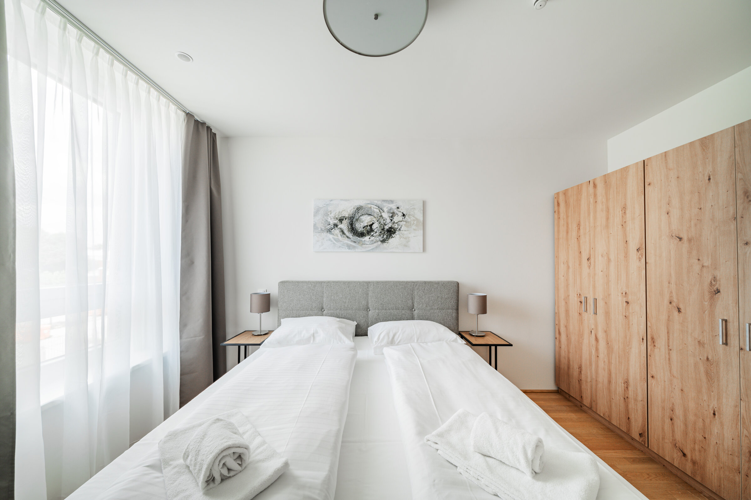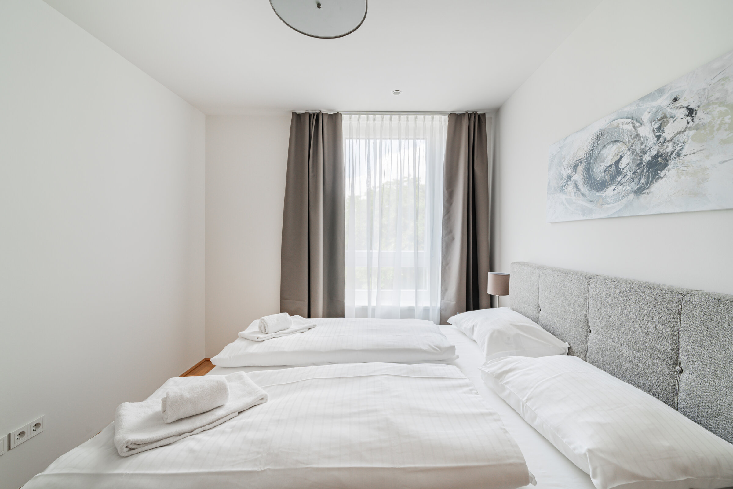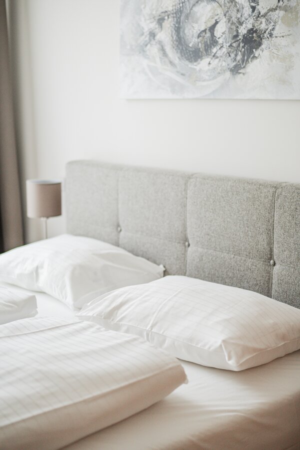 The new and modernly furnished 3-bedroom apartment is located in a recently built high-rise building near Donau Zentrum shopping center and has a balcony/loggia featuring a seating area.